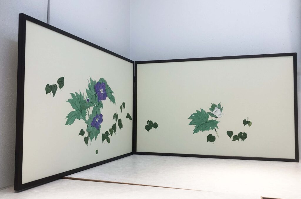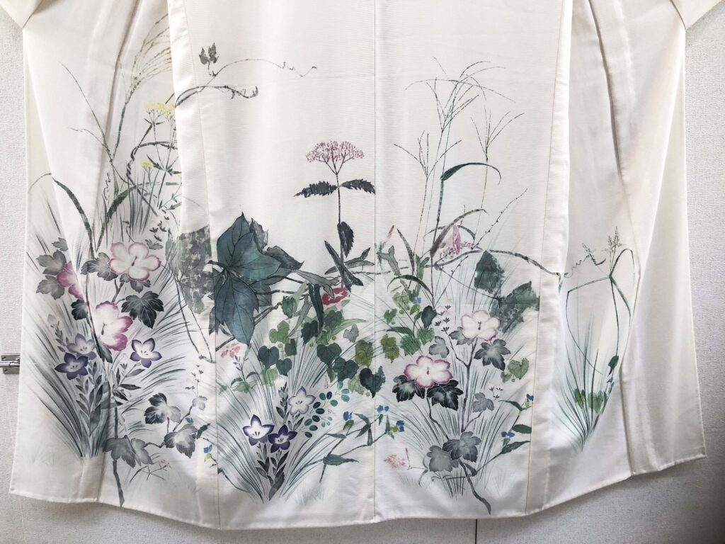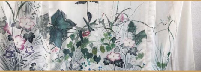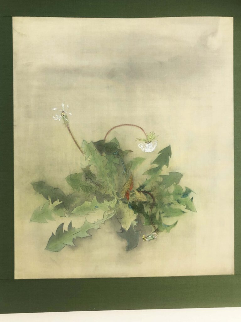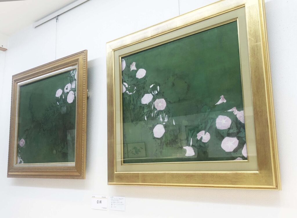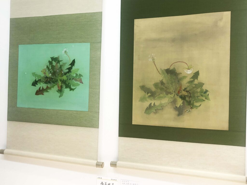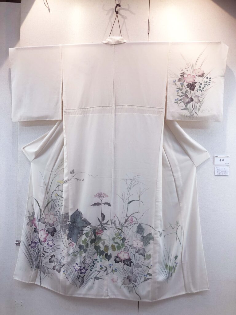 個展では、植物を描いた日本画がほとんどですが、和服に雑草や花をリキテックスで直接描いたものもありました。